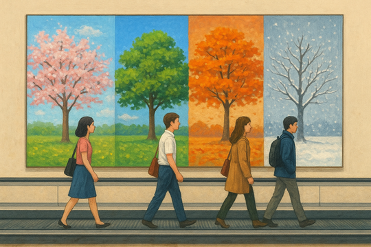 空港によくあるような動く歩道に乗り、春も夏も秋も冬も同じ幅の1枚の絵画を前に、秋だけ急ぎ早に過ぎ去っているのは私たちなんじゃないかと。